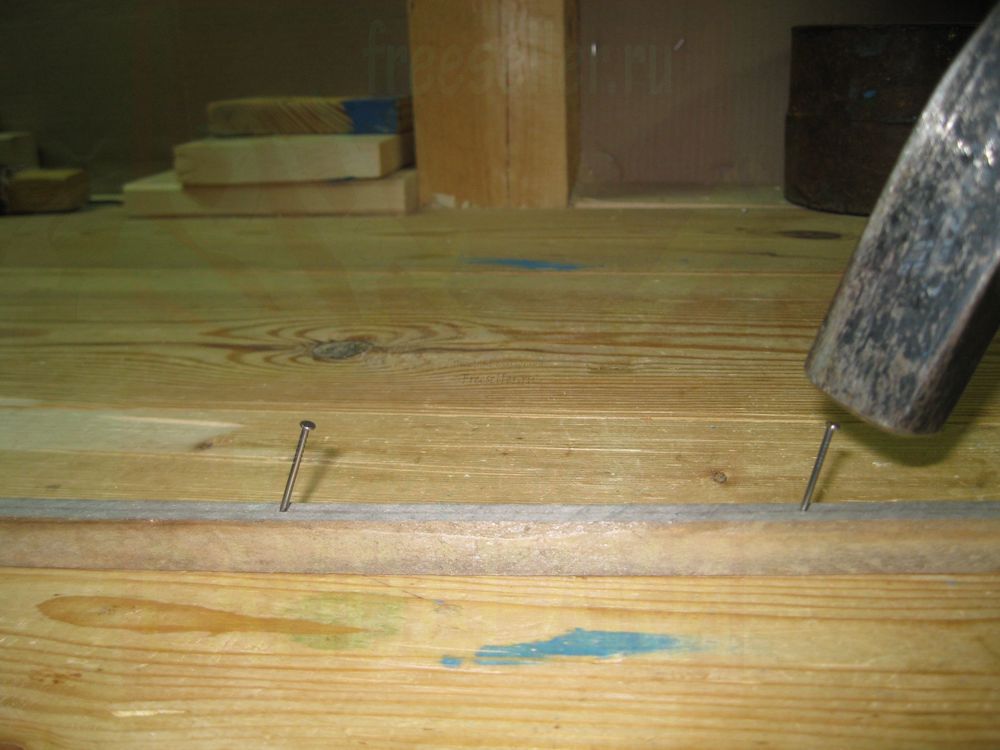 Затем забиваем в боковые рейки мелкие гвоздики с шагом в 8-10 мм. Всего в каждую рейку забиваем по 12-14 гвоздиков.