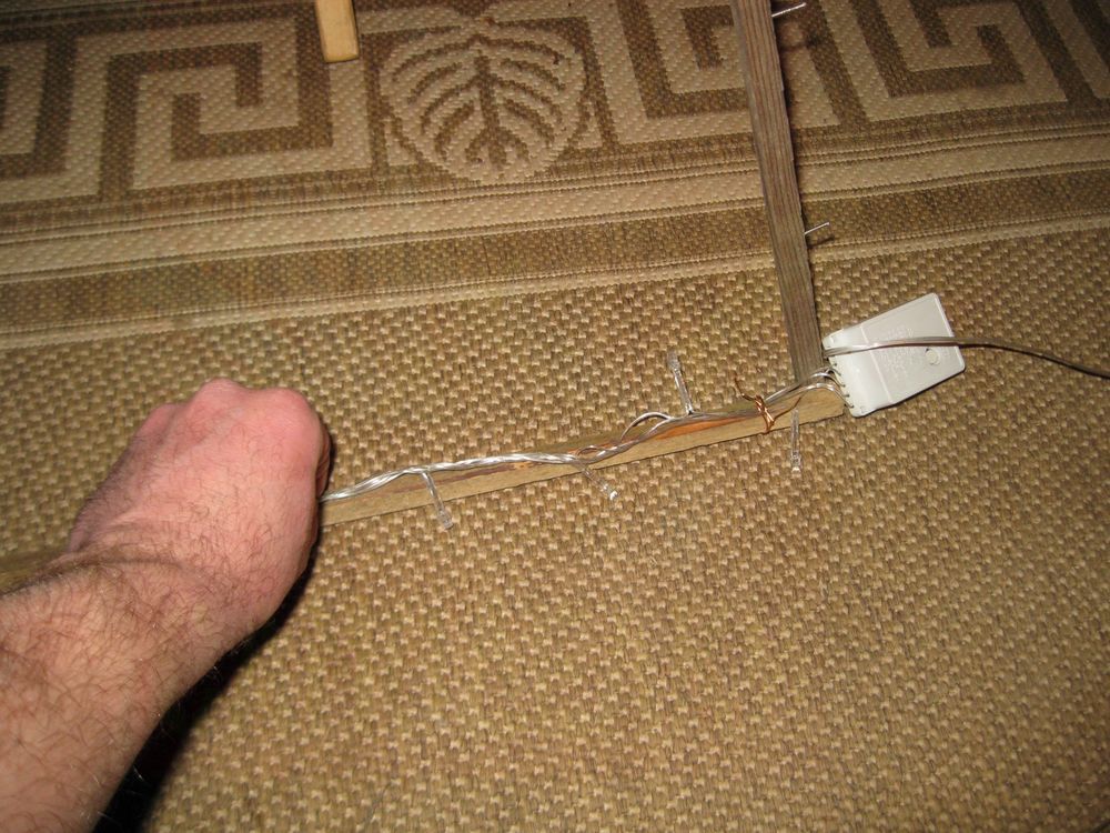Сначала крепим проволокой на основании каркаса начальную часть гирлянды. При этом у вас должна остаться сбоку коробочка управления режимами работы гирлянды и небольшая часть провода с вилкой для подключения гирлянды к электросети.