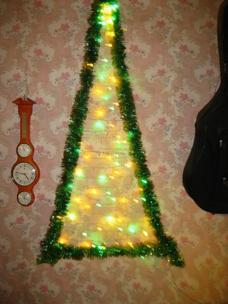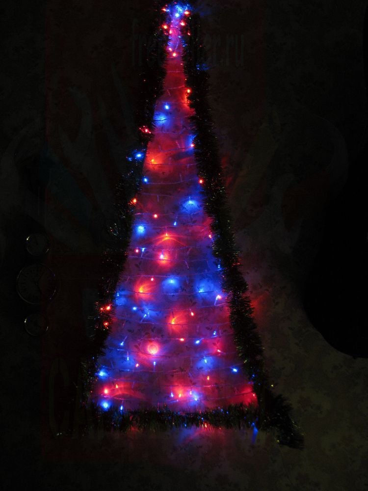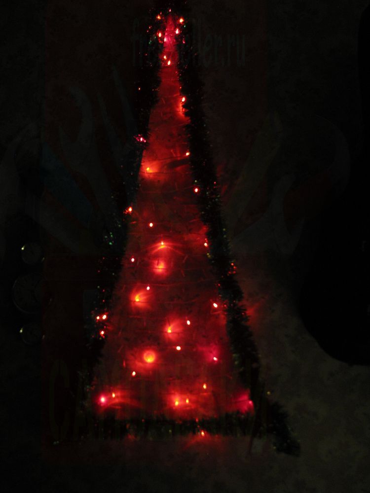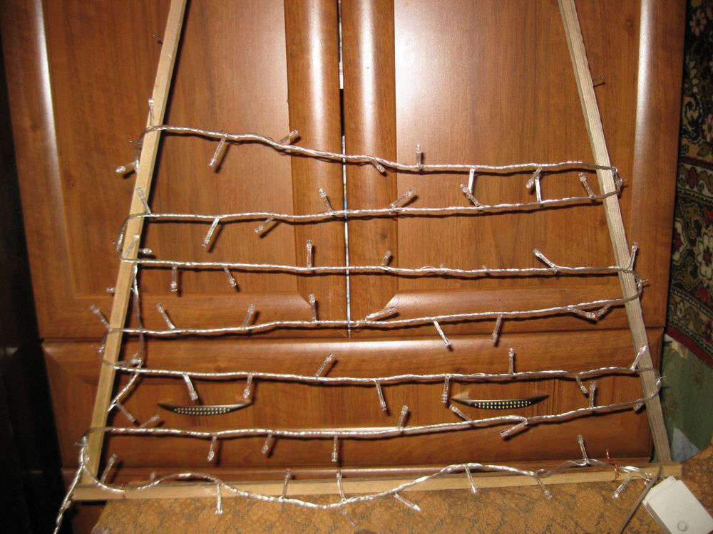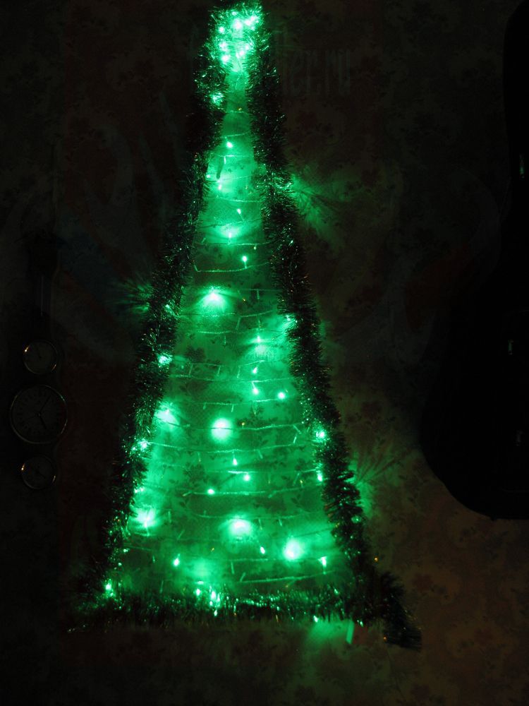 Новогоднее украшение в виде каркаса из деревянных реек сделанного в форме елочки с намотанной на нем светодиодной электрогирляндой и украшенного по контуру мишурой.