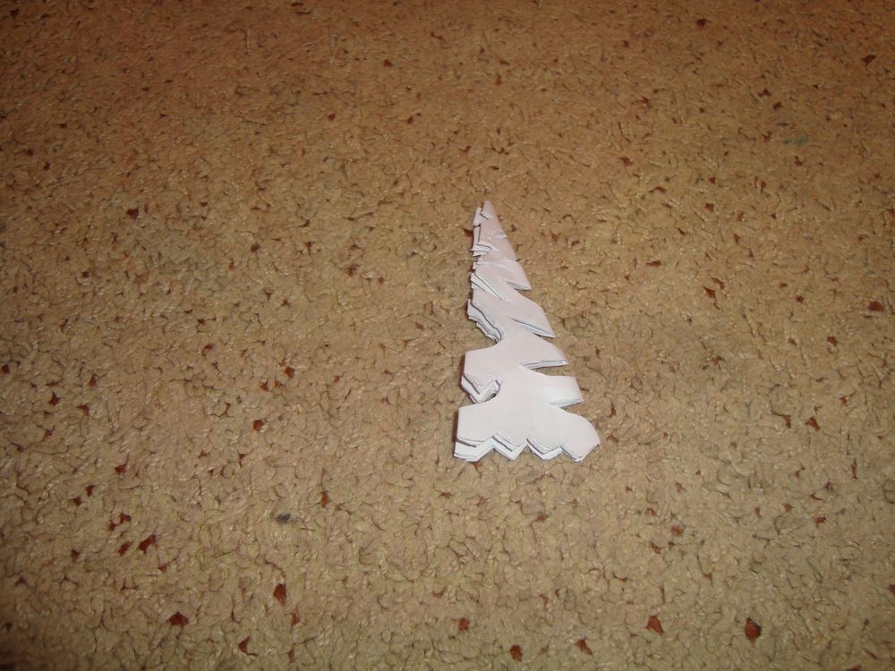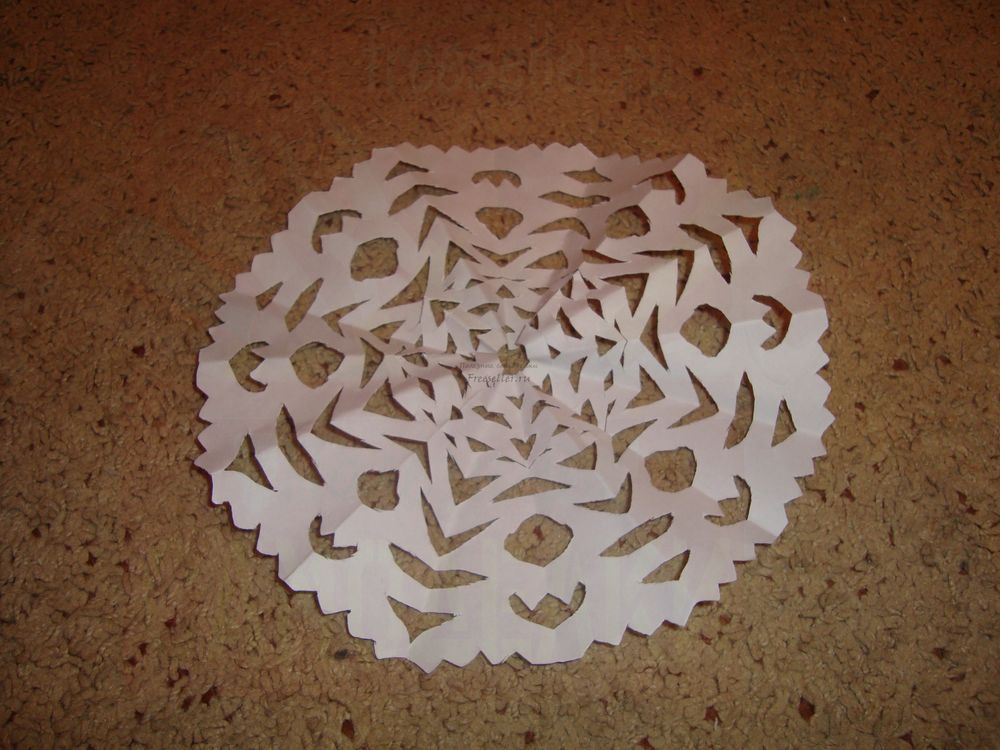 Теперь из другого листа бумаги формата А4 создайте большую снежинку. Для этого сверните в несколько раз бумагу и вырежьте разнообразные узоры из сложенных краев. Можно вырезать треугольники, круги, сердечки, завитушки и т.д.