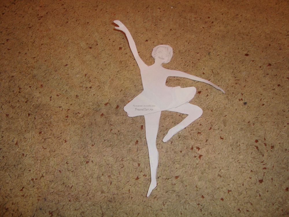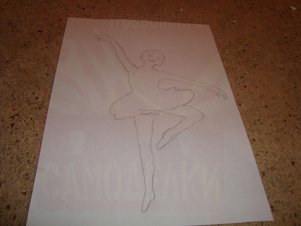 На первом этапе необходимо нарисовать балерину на весь лист формата А4. Если у вас не большие художественные навыки, то воспользуйтесь трафаретом. Им может послужить любой изображение балерины, вырезанное из газеты, журнала или распечатанное из интернета.