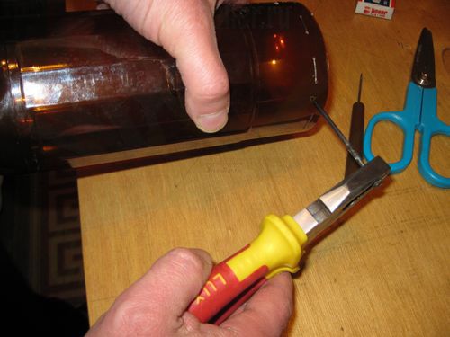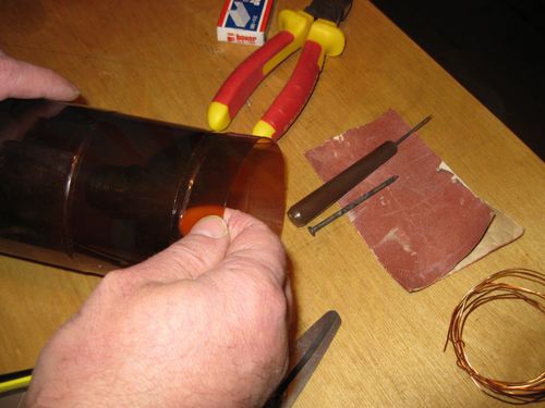 Затем скрепляем горловину с корпусом бутылки при помощи канцелярских скоб. Для этого прокалываем в верхней части корпуса шилом по два отверстия на расстоянии равном длине скобы.