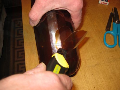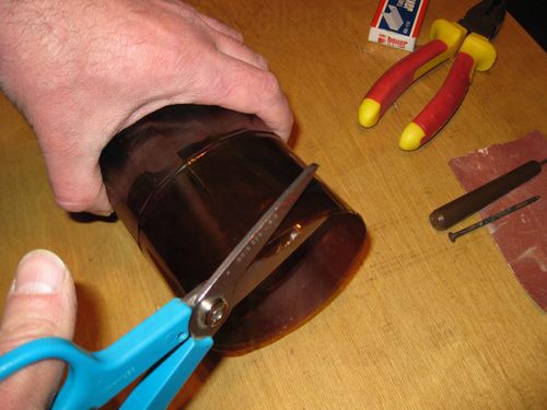 После этого выравниваем верхнюю часть бутылки вместе со вставленной горловиной ножницами.