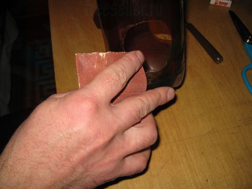Далее обрабатываем все кромки наших отверстий, а также верхний край кормушки мелкой наждачной бумагой, чтобы птички не порезали свои лапки, да и нам самим не прорезаться.