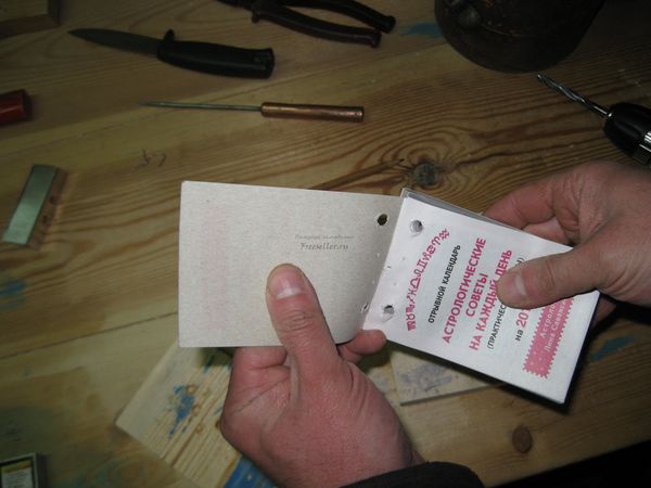 Накалываем метки отверстий шилом для более точной установки сверла и сверлим в календаре отверстия. При этом желательно во время сверления положить сверху на календарь толстую дощечку и прижать ее посильнее. Это необходимо для того, чтобы страницы календаря были плотно сжаты и лучше и чище сверлились.