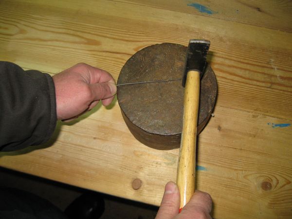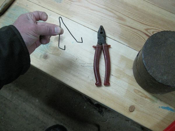 Теперь нужно сделать проволочную державку, на которую мы будем вешать наш календарь. Для этого, если необходимо, выпрямляем проволоку молотком и сгибаем ее пассатижами.