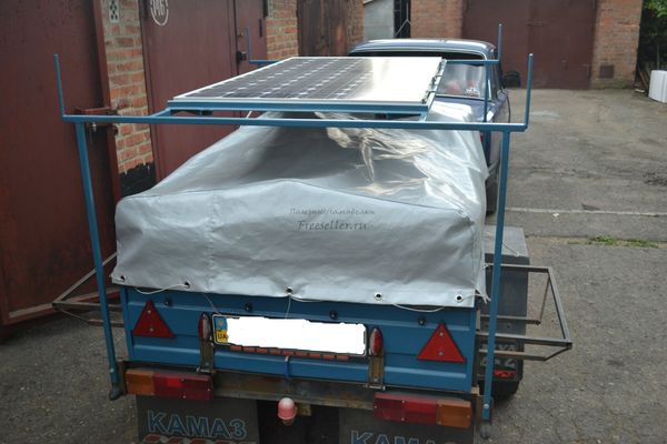 Багажник для грузового прицепа с солнечной панелью и возможностью перевозки разного габаритного туристического снаряжения.