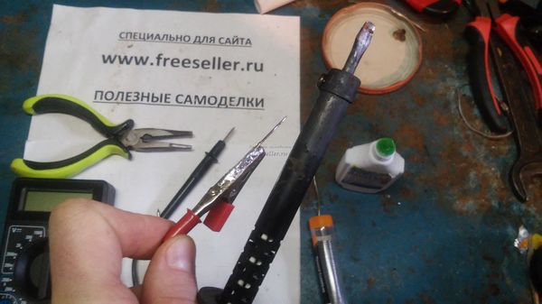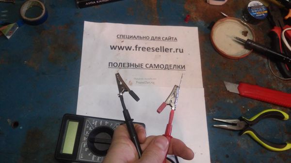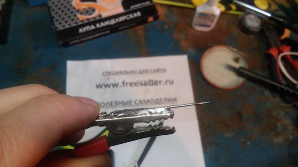 Сперва припаиваем к одному из "крокодильчиков" иголку (такое приспособление поможет не повреждая изоляции, проводить замеры)