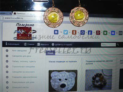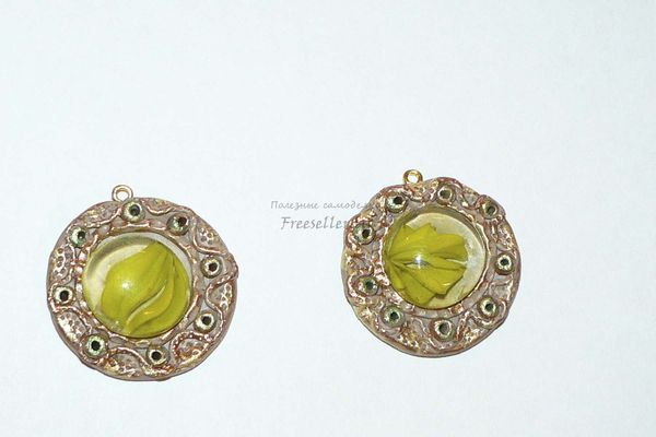Вставляем в серьги штифты, делаем это очень осторожно, чтобы штифты не вышли сзади, и не испортилась форма украшения, ведь полимерная глина очень мягкий материал.