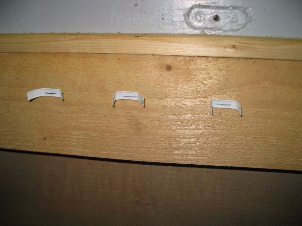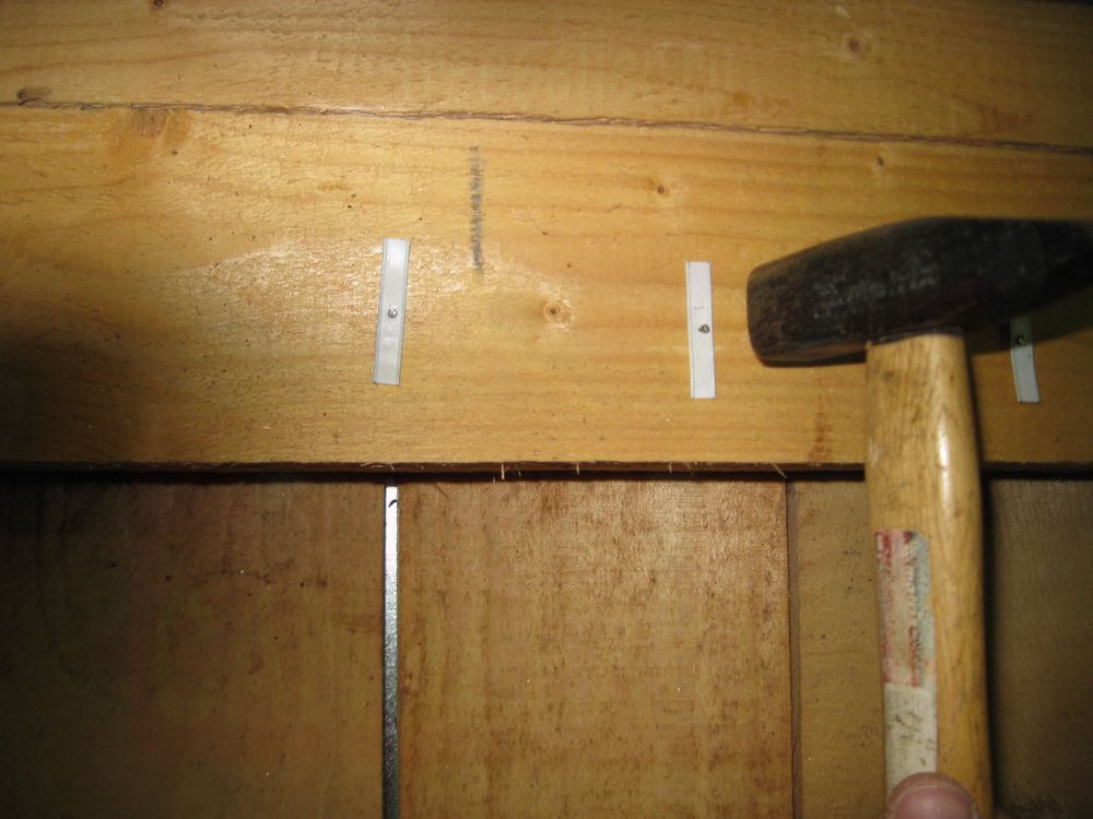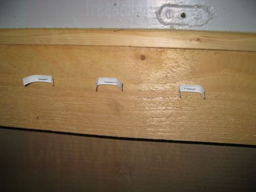 Для этого необходимо каждый хомут прибить к стене двумя маленькими гвоздиками. Или же лучше и проще, прибить хомуты скобами с помощью строительного степлера.