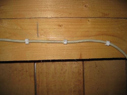 Затем берем кабель и крепим его к стене при помощи хомутов. Причем для этого даже не нужны никакие инструменты, так как проволока хомутов легко гнется пальцами.