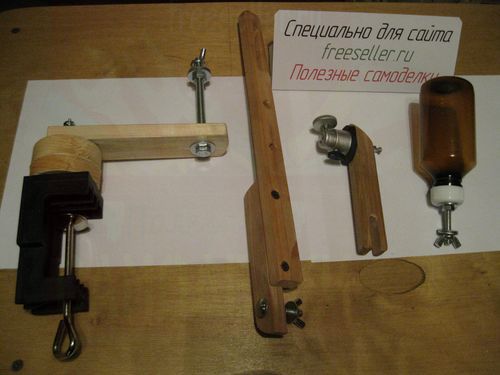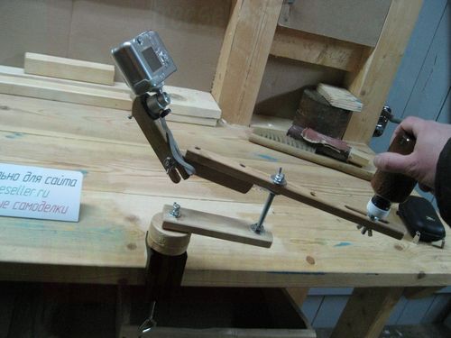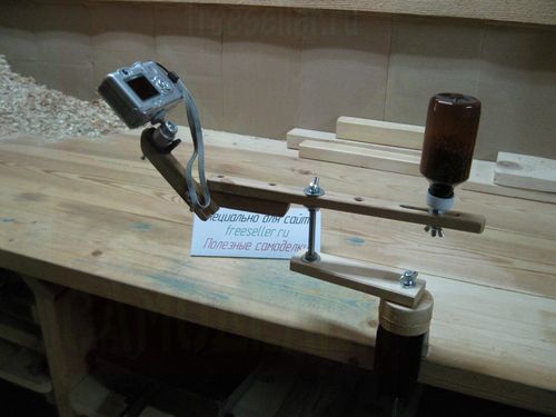 При этом, как правило, инструмент приходится держать двумя руками и при этом самому невозможно сделать фото, приходится кого-то просить, что естественно не всегда возможно. Или, например, просто бывают случаи, когда все руки оказываются в опилках или стружках, что тоже не способствует нормальной съемке. В результате я решил изготовить и сконструировать специальный штатив. Причем особенностью этого штатива является то, что он крепится на стол или на верстак и позволяет делать фото, сверху и немного сбоку, что как раз и требуется при фотографировании большинства самоделок. При этом сразу должен сказать, что никаких чертежей я не делал, поскольку все детали изготавливал экспромтом и додумывал и дорабатывал буквально на ходу. Кроме того, некоторые наиболее важные детали или узлы я не делал сам, а позаимствовал их из комплектов других устройств (о чем подробнее расскажу ниже).