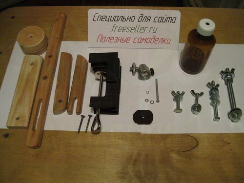 Как видно на фото, помимо деревянных деталей, я использовал еще два готовых узла позаимствованных из комплектов других устройств. Так из комплекта бормашины я взял зажимной кронштейн, предназначенный для крепления к столу стойки для подвешивания бормашины. И еще для крепления фотоаппарата к штативу, я взял шарнирную головку, изначально предназначенную для крепления к подставке-треноге, лазерного уровня. Кроме того, для надежной фиксации шарнирной головки, я вырезал из куска резины прокладку и просверлил в ее центре отверстие диаметром 4 мм. Помимо этого я нашел небольшой пластиковый пузырек с пробкой, в центре которой я просверлил отверстие диаметром 6 мм, для крепления. Его я использовал в качестве противовеса. Ну и кроме всех упомянутых деталей, я использовал для крепления узлов штатива, несколько крепежных элементов, в том числе различной длины болты М4, М6 и М8 с шайбами и гайками (обычными шестигранными и барашковыми). После того, как все детали были собраны, я приступил к следующему этапу - сборке основных узлов штатива.