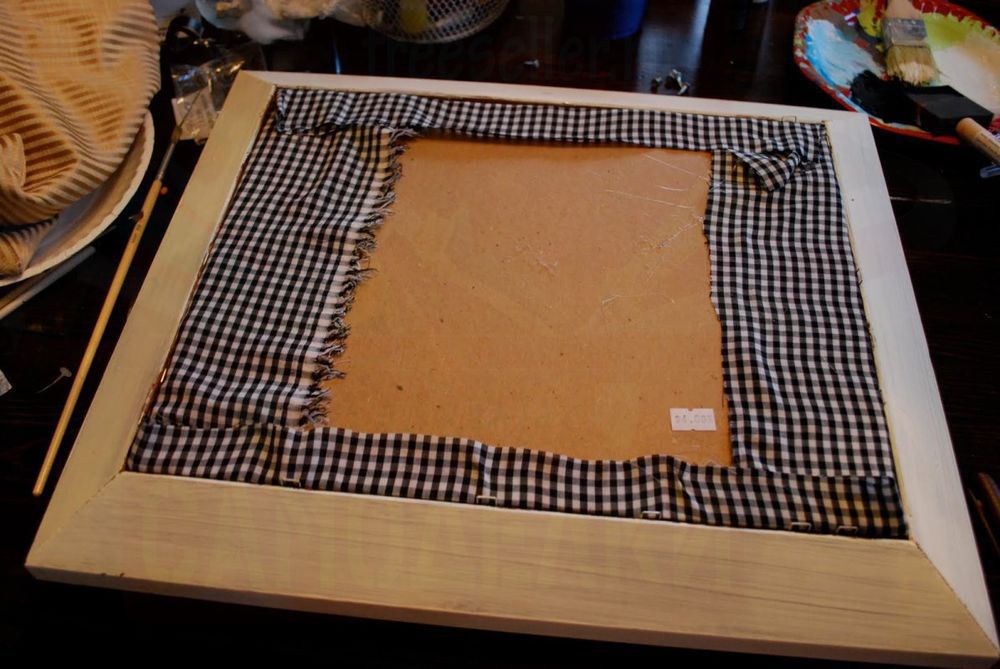 Теперь нужно чем-то красивым и подходящим заполнить рамку. Можно вставить красивую картинку, а можно выбрать ткань симпатичной расцветки. Возьмите кусок многослойной фанеры и обтяните его куском ткани. Вставьте фанеру с тканью в рамку и приклейте торчащие с оборотной стороны куски ткани к рамке клеем.