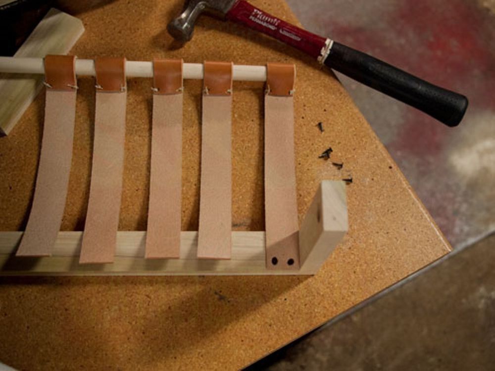 Когда ремни готовы и подшиты, то их нужно насадить на шпонку с одинаковым интервалом. Не подшитый конец надо прибить гвоздиками с помощью сапожного молотка.