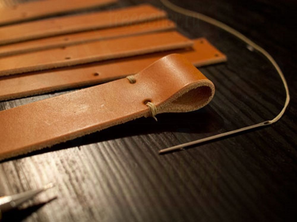 Затем вощеными нитями и специальной иглой делаем на конце каждой кожаной полоски петли, в которые должна свободно входить деревянная шпонка. Для изготовления этой корзины понадобились 6 кожаных ремней.