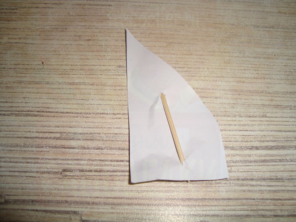 Вставляет зубочистку, с ее помощью мы закрепим парус.