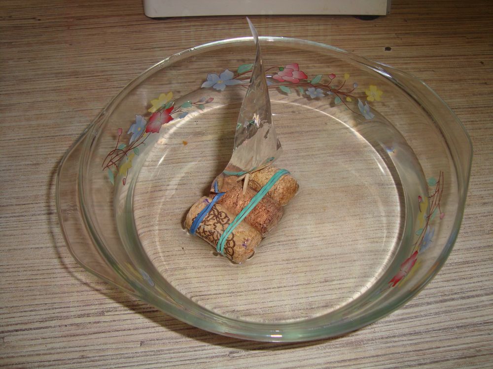 Другой край зубочистки втыкаем в центр плота и наш кораблик готов.