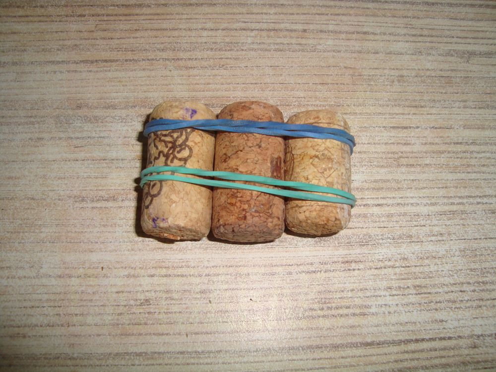 Сначала делаем плот из трех пробок, они и позволят конструкции не утонуть.