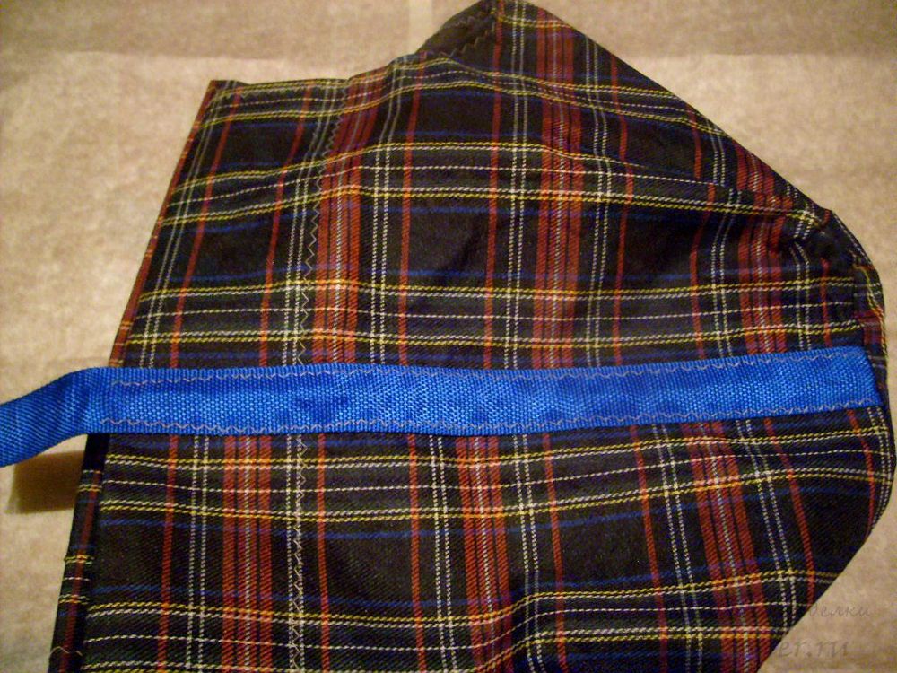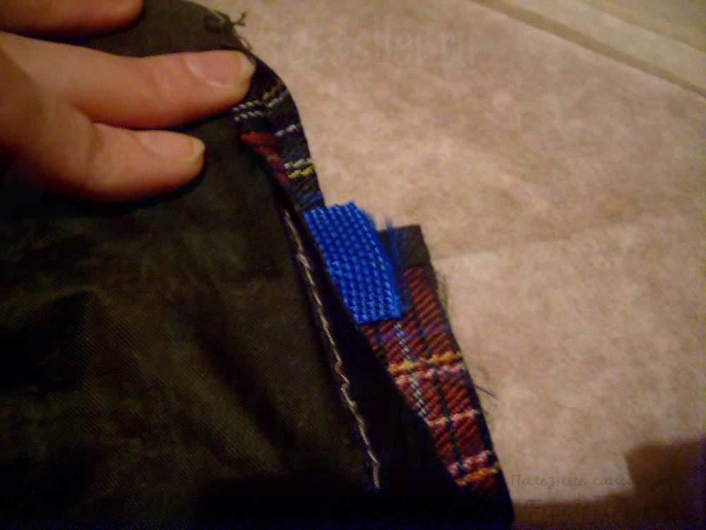 Закладываем конец стропы в подпоротый шов. Прошиваем его заново.