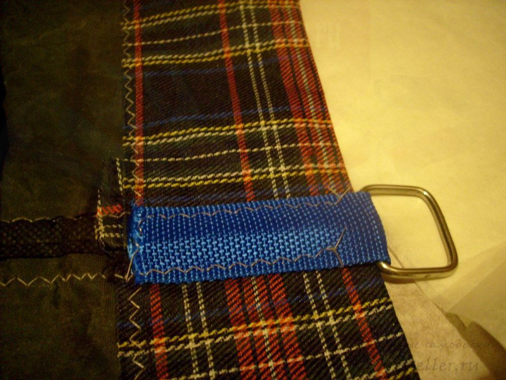 Надеваем пряжки. Заворачиваем верхний конец стропы вовнутрь сумки и пристрачиваем с обеих краёв зигзагом.