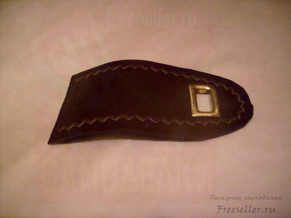 Вырезаем из дерматина две одинаковые детали клапана. Складываем их вместе изнанкой вовнутрь и прострачиваем по внешнему контуру зигзагом. По разметке делаем прорезь и крепим рамку замочка.