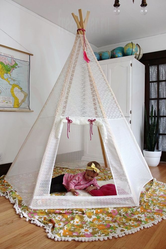 Какой ребенок откажется поиграть в своем вигваме? Все взрослые помнят, как сами играли дома, и строили из пледов и одеял свои собственные вигвамы. Можно легко смастерит такой вигвам, который будет очень красиво и необычно смотреться в детской комнате.