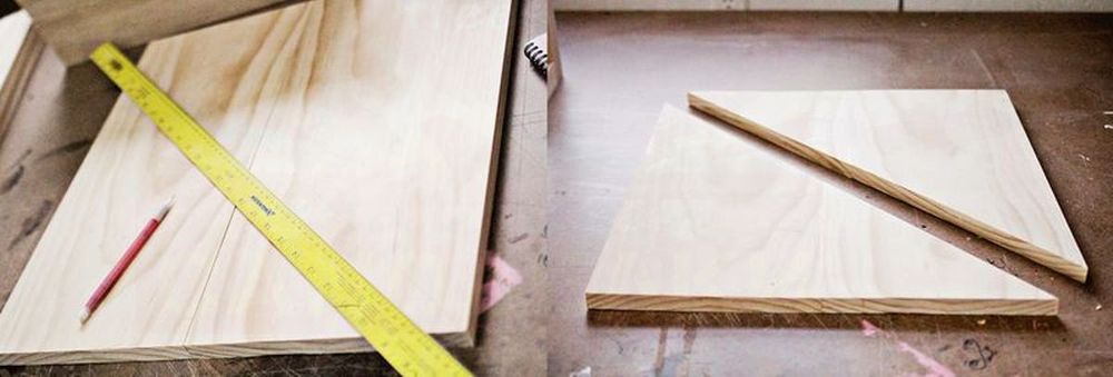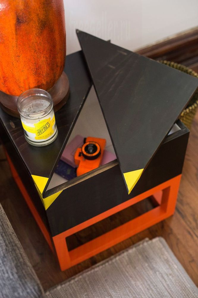 Для крышки и дна используем доски, размером 23 х 45 см. Дно можно привинтить или приклеить, это уж как вам нравится, в том виде, в котором он был и до этого. С крышкой все обстоит немного иначе. Для того. чтобы избежать опрокидывания предметов, стоящих на тумбочке - стакана с соком или вазы с цветами, например, конструкция крышки будет непривычная откидная, крышка будет отодвигаться в бок, «съезжать» со своего места.Для этого доску разрежьте по диагонали. Один из получившихся треугольников прибейте маленькими гвоздиками к корпусу тумбочки, он будет неподвижен. Второй треугольник просто укладывается рядом.