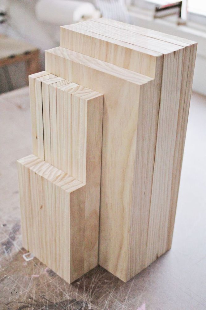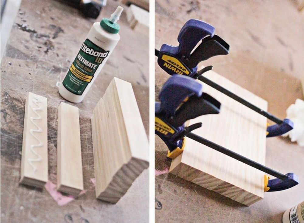 Намажьте клеем, предназначенным для работы с древесиной, бруски 21 х 4 см и 38 х4 см попарно и прижмите их для лучшего склеивания. Это будущие ножки тумбочки.