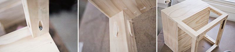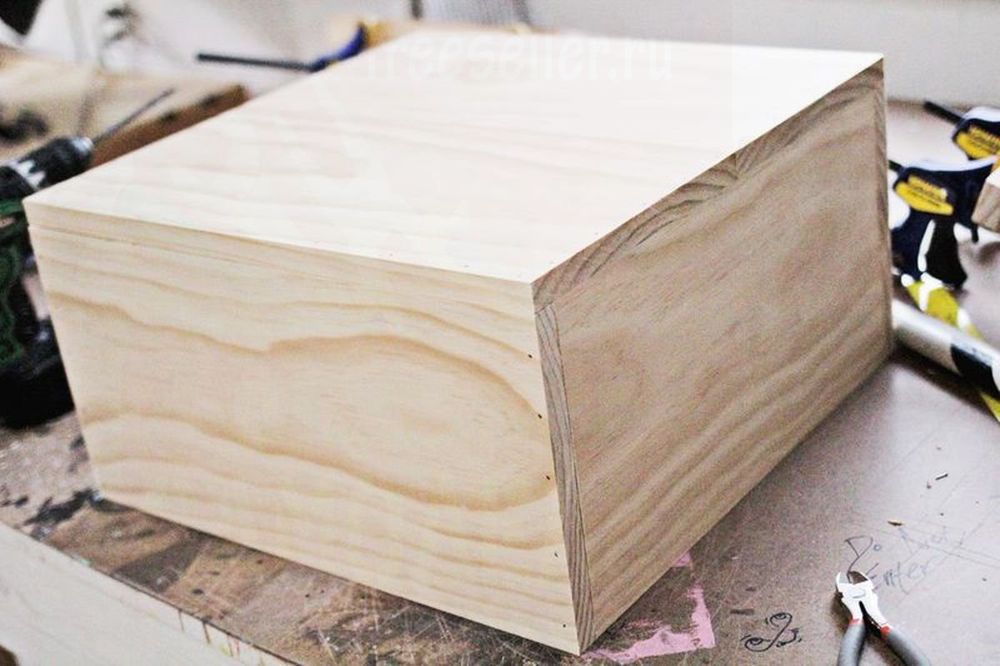 Пока ножки для тумбочки сохнут, можно сделать корпус. Для него понадобятся четыре доски 23 х 45 см и две 23 х 41 см. Между собой части соединяются с помощью клея для дерева. После того, как обе части конструкции будут готовы, просверлите в ножках потайные отверстия и привинтите ножки к корпусу.