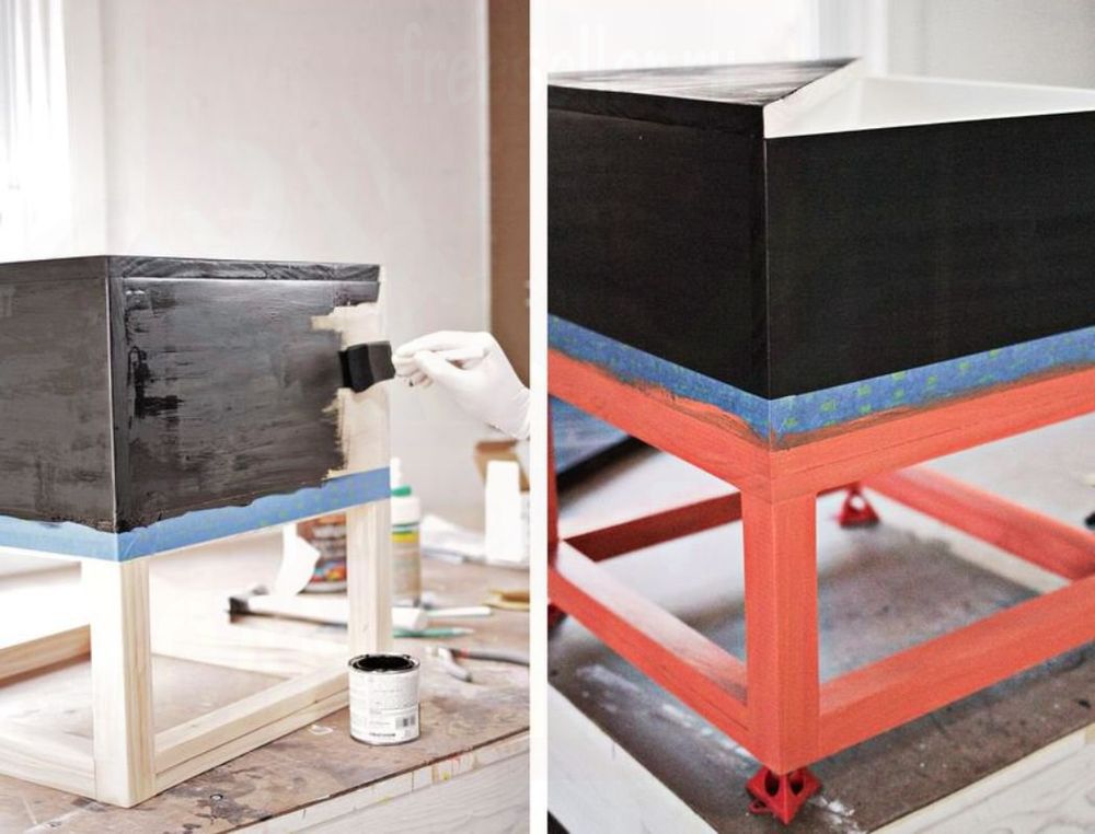 Пришла пора придать готовой тумбочке желаемый цвет. Если вы планируете окраску в несколько цветов, то, предварительно, оклейте границы зон разных цветов малярным скотчем, иначе, они неизбежно окажутся смазанными.