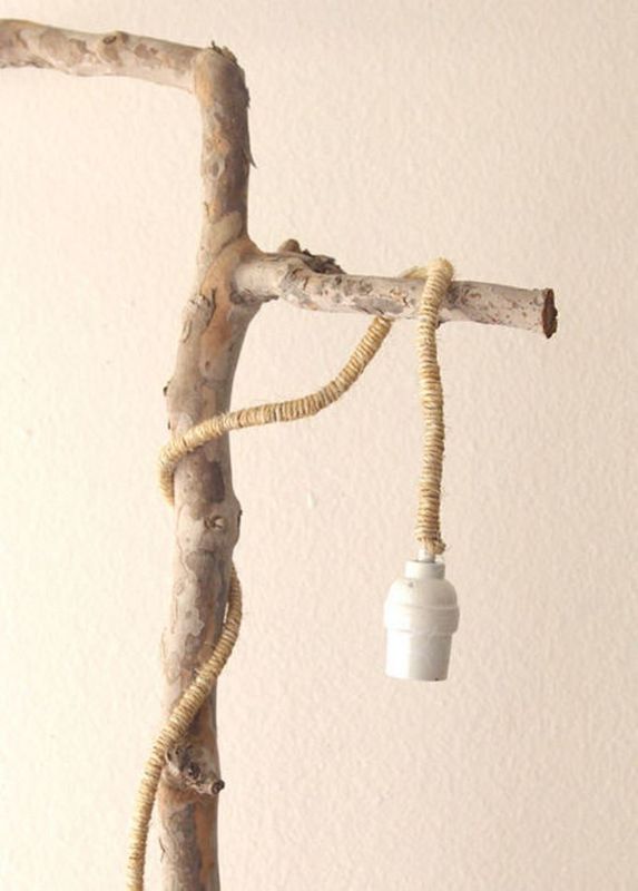 На штатив, например, деревянную палку, прикрепляют светильник. Скрепляют все шнуром из сизаля. Осталось вкрутить лампочку и светильник заработает.