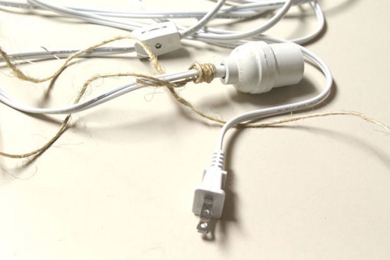 В проделанное отверстие вставляют электрический шнур и вкручивают патрон. Провод, который будет виден, обматывают шнуром из сизаля.