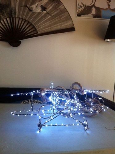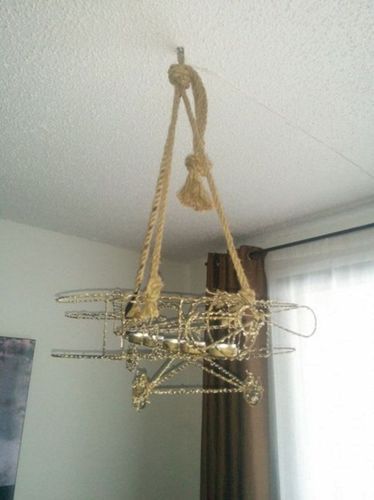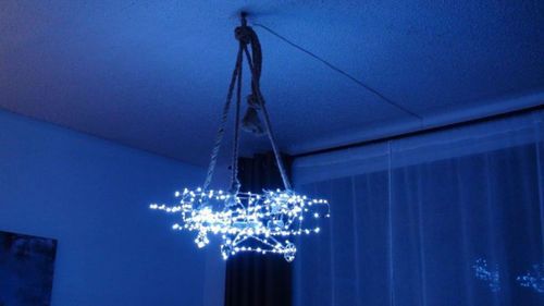 На винт вешается крючок с веревкой, на него - каркас люстры. С помощью клея кабель протягивается вдоль потолка и стен до розетки. Люстра готова к работе!![]()