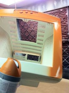 Когда монитор без внутренностей собран, с экрана демонтируются лишние ярлыки, поверхность обрабатывается наждачной бумагой.