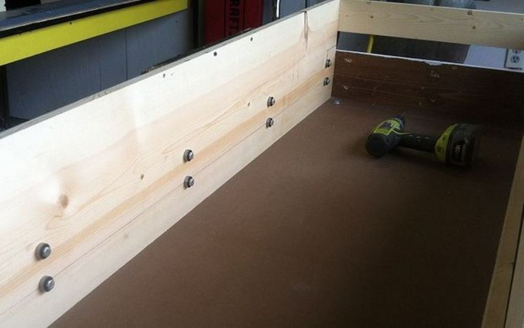 Вырежьте кусок фанеры, на сантиметр меньший, чем размеры пола в багажнике. Из фанеры вырежьте боковины ящика нужно длины и высоты. Соедините части между собой болтами так, чтобы получилась вместительная деревянная коробка, свободно стоящая в автобусе.