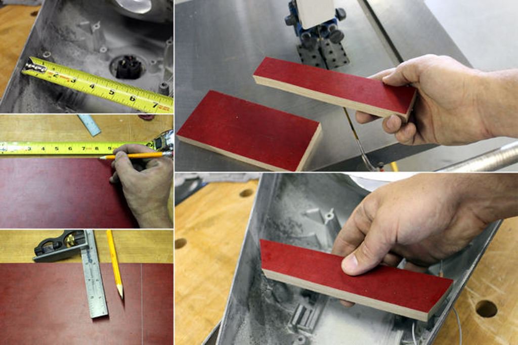 К счастью в самом светильнике были резьбовые отверстия на внутренней стороне светильника, подходящие для крепления кронштейна. Измерил расстояние между креплениями, отрезал полосу от куска отходов фанеры толщиной 20 мм, чтобы использовать его в качестве кронштейна. Подогнал размер полоски фанеры под размер корпуса светильника и просверлил отверстия соответствующие крепежным отверстиям на корпусе светильника.