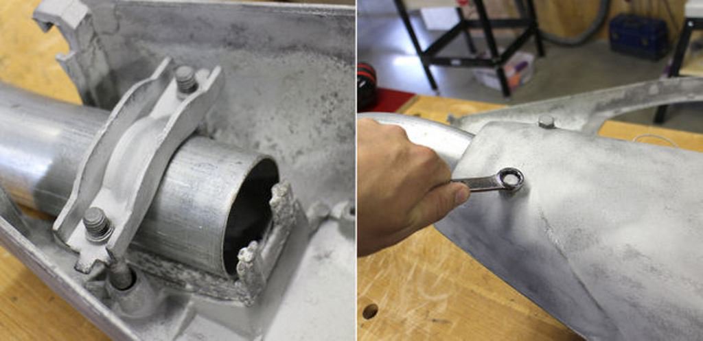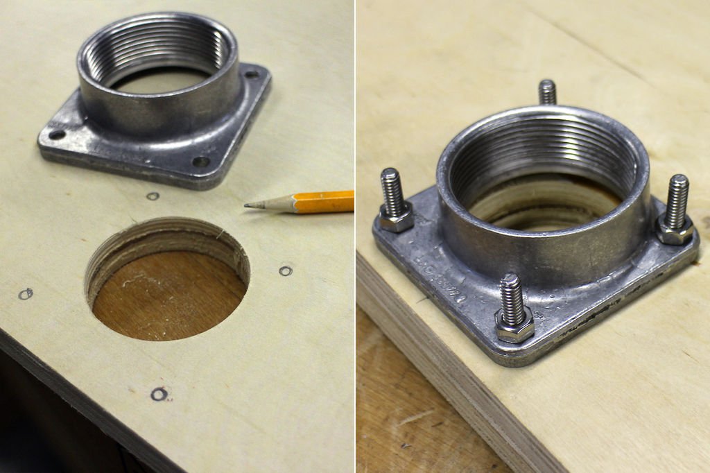 После того как все компоненты были готовы Джон закрепить светильник с коленом на вертикальной стойке. Так как EMT трубы имеют гальваническое покрытие, поэтому использовать сварку было нельзя. Но, к счастью, продаются двухдюймовые EMT обжимные муфты. Муфта обжалась на колене и на вертикальной стойке, скрепив детали вместе. Консоль получилась не очень длинная, и сам светильник получился не очень тяжелым, поэтому муфта будет держать светильник надежно.