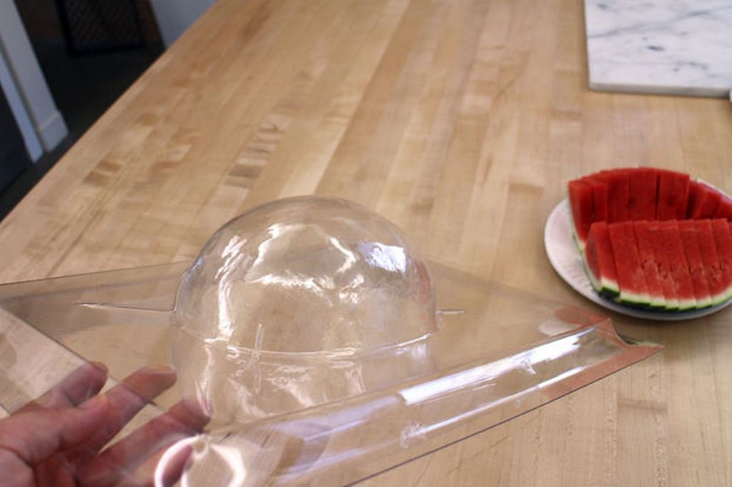 После остывания пластик затвердевает и сохраняет принятую форму. Вы поймете, когда лист пластика можно будет опустить на предмет (в данном случае арбуз) - он начнет провисать под нагревательным элементом. Это видно на фото 4 и 5 в этом шаге.