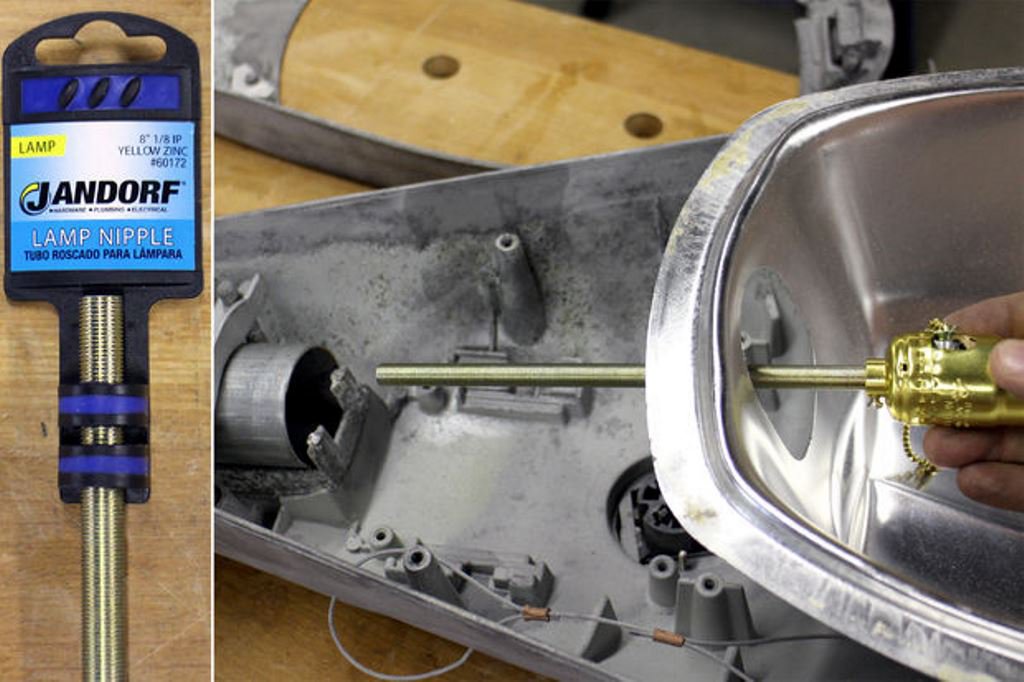 Для патрона с цепочным выключателем нужно было сделать кронштейн, чтобы закрепить его для надежной работы. Для этого Джон прикрепил патрон к ниппелю и поместил сборку в светильник туда, куда хотел установить патрон. Так как уличный светильник не был предназначен для такой маленькой лампы, поэтому ему пришлось сделать собственный держатель, чтобы закрепить ниппель с патроном.