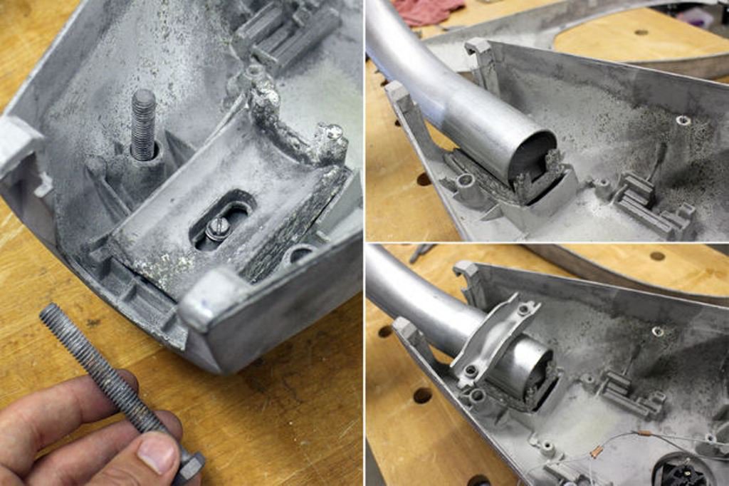 Уличный фонарь крепится на 2-х дюймовое колено при помощи кронштейна, имеющего два больших болта, которые все это соединяют. Болты и кронштейн он тщательно зачистил металлической щеткой. Затем установил в задней части светильника колено 90°, сверху поставил кронштейн и стянул всю конструкцию болтами.