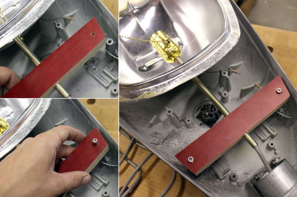 Питающий кабель он пропустил через ниппель и подключил к патрону. Собрал патрон, закрепил его на ниппеле и установил деревянный кронштейн в корпус светильника на винты.