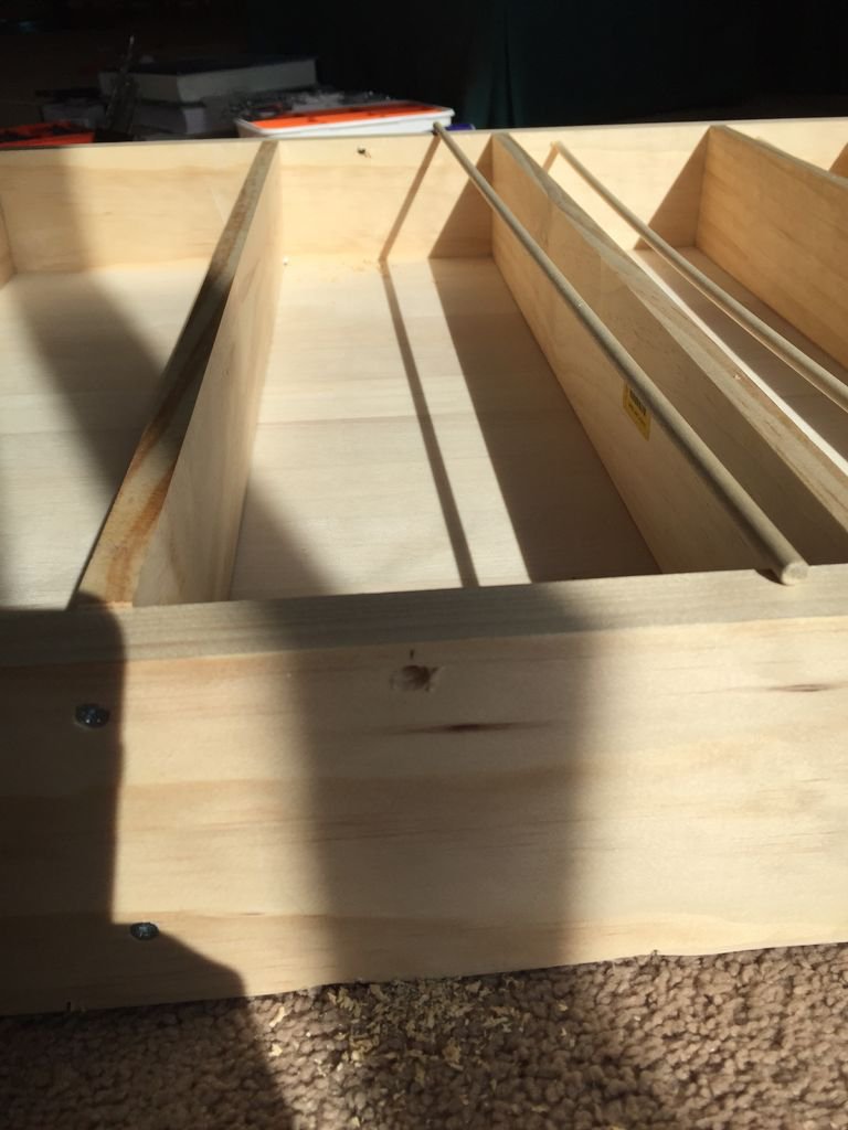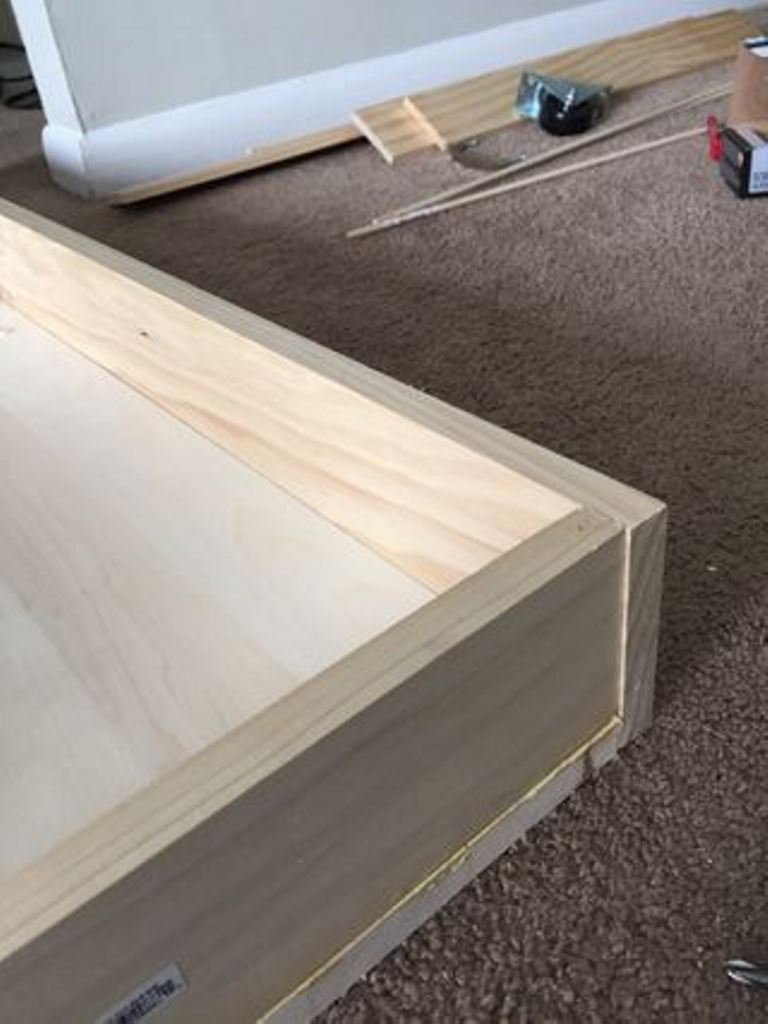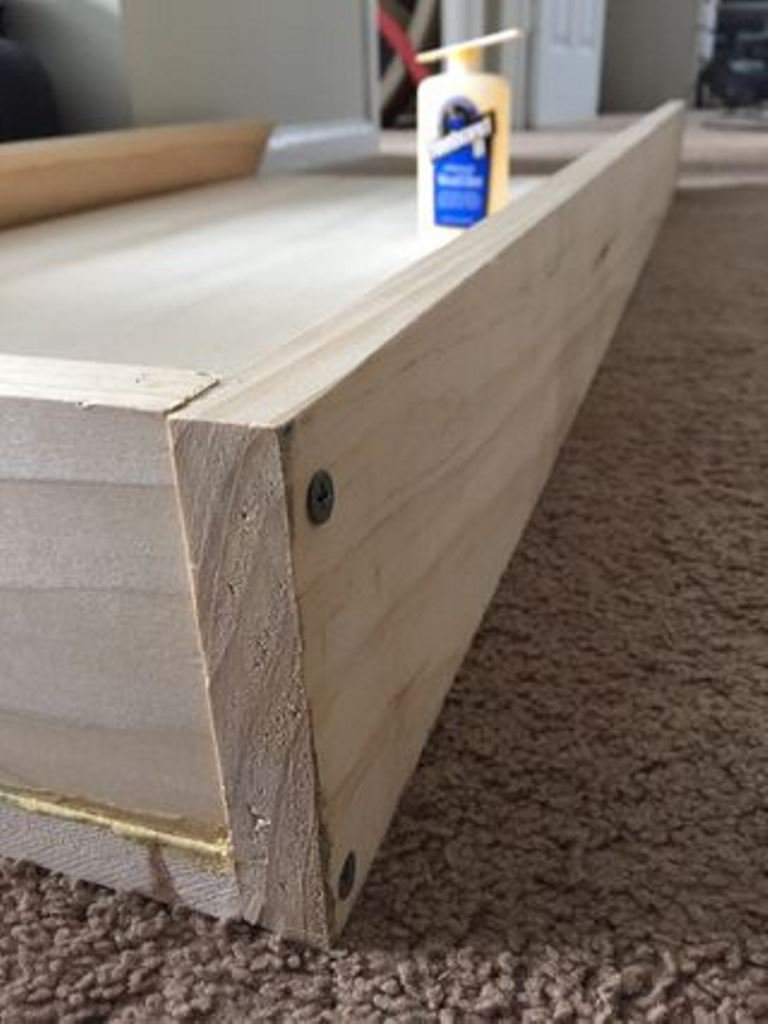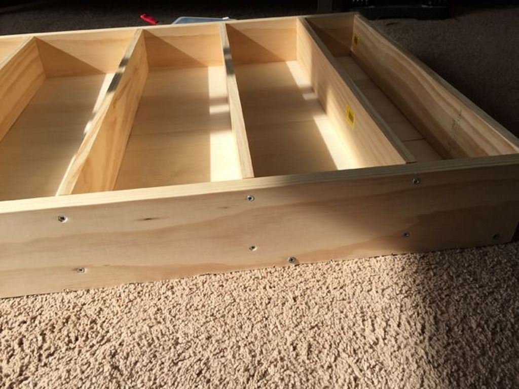 Каркас представляет собой 4 боковых стенки с основание из фанеры или широкой доски. Для соединения элементов использовался столярный клей и саморезы.