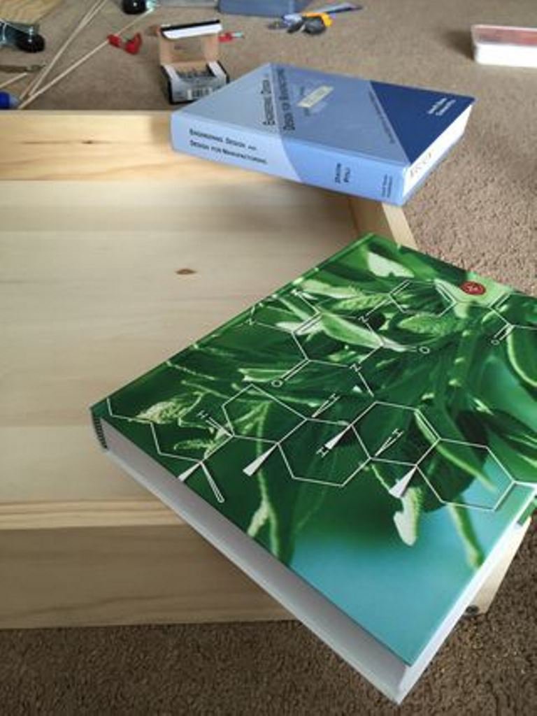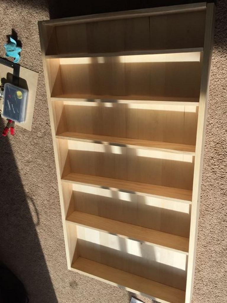 Полки соединяются с каркасом с помощью саморезов (чтобы избежать лопин при затягивании саморезов, имеет смысл просверлить в деталях отверстия сверлом меньшего диаметра, чем саморез).