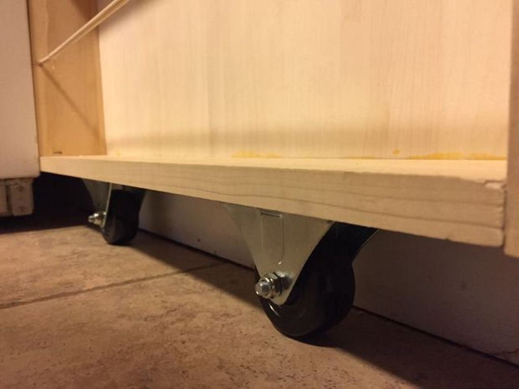 Осталось прикрепить колесики к нижней части полки, и ручку к боковой стенки кладовой.