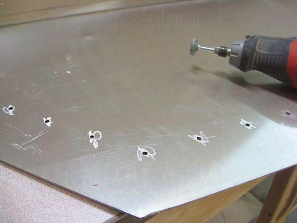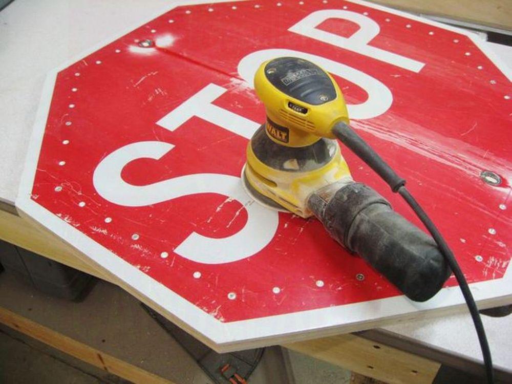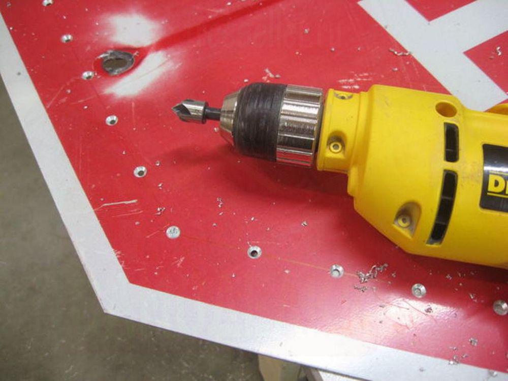 По всему периметру знака делаем отверстия таким образом, чтобы головки винтов при установке оказались заподлицо со знаком. Сверлите с наружной стороны внутрь, чтобы заусенцы оказались с изнанки. Их после нужно удалить роторным шлифовальным инструментом.