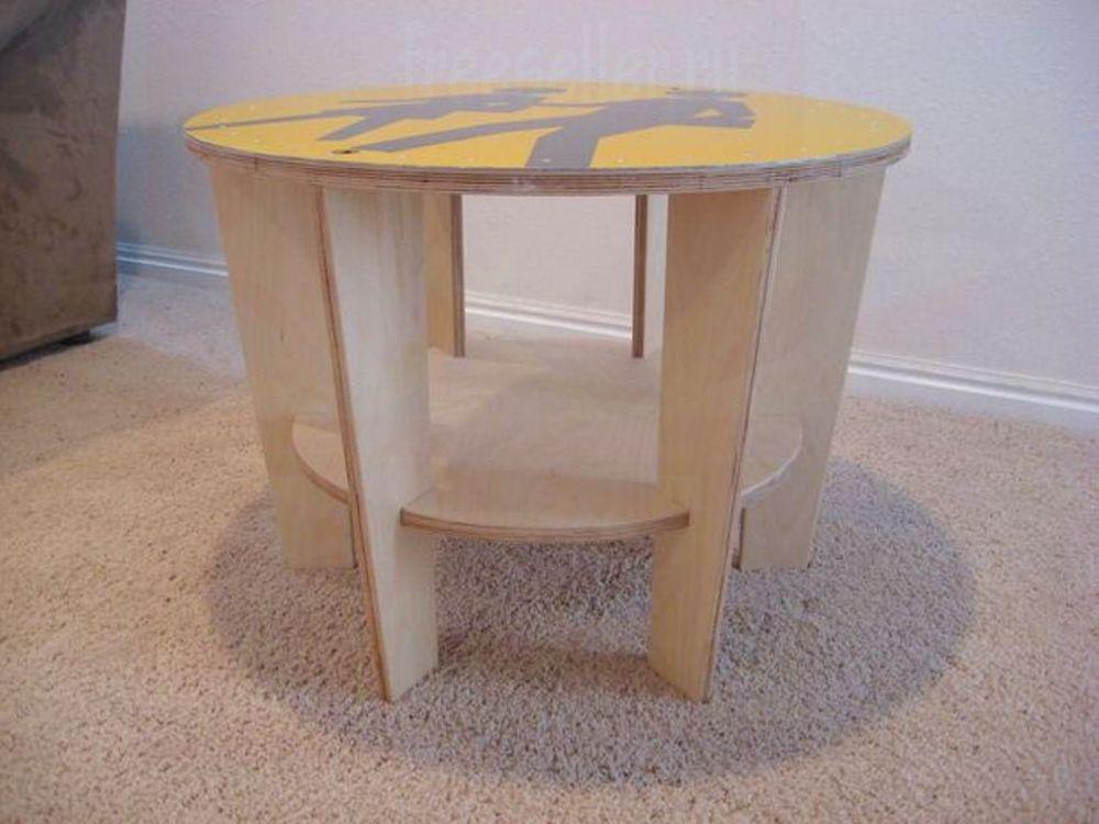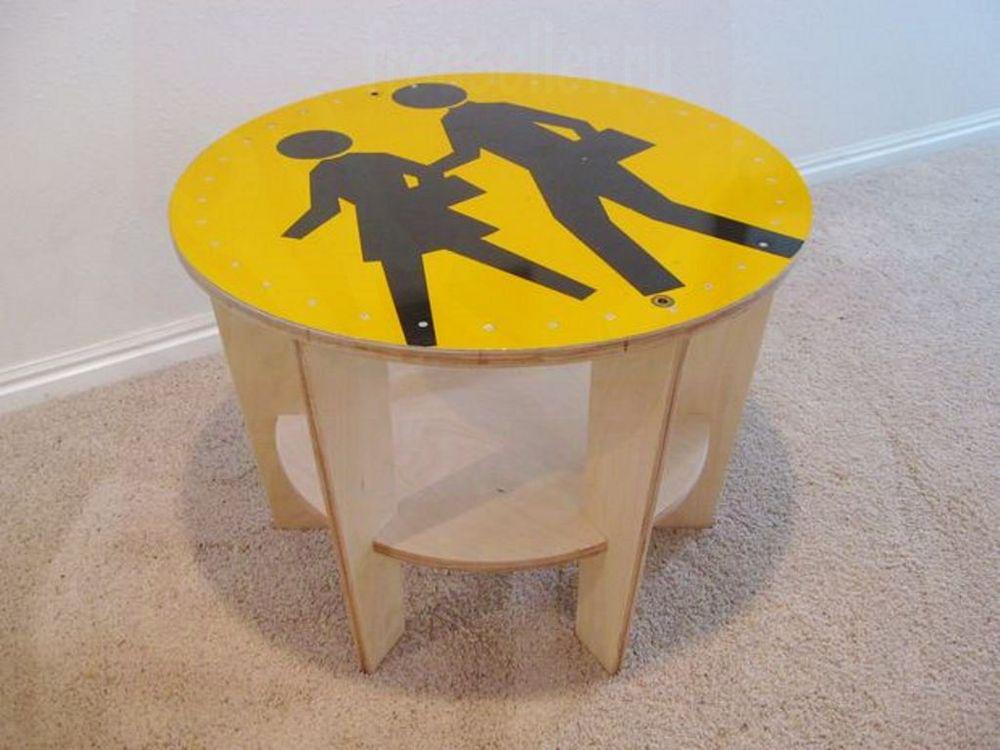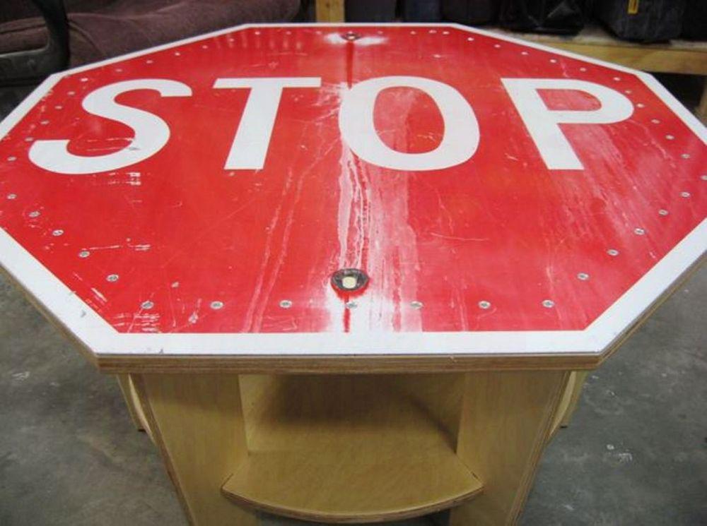 Оригинальный и, в то же время, простой самодельный столик можно сделать из березовой фанеры и старого знака СТОП.