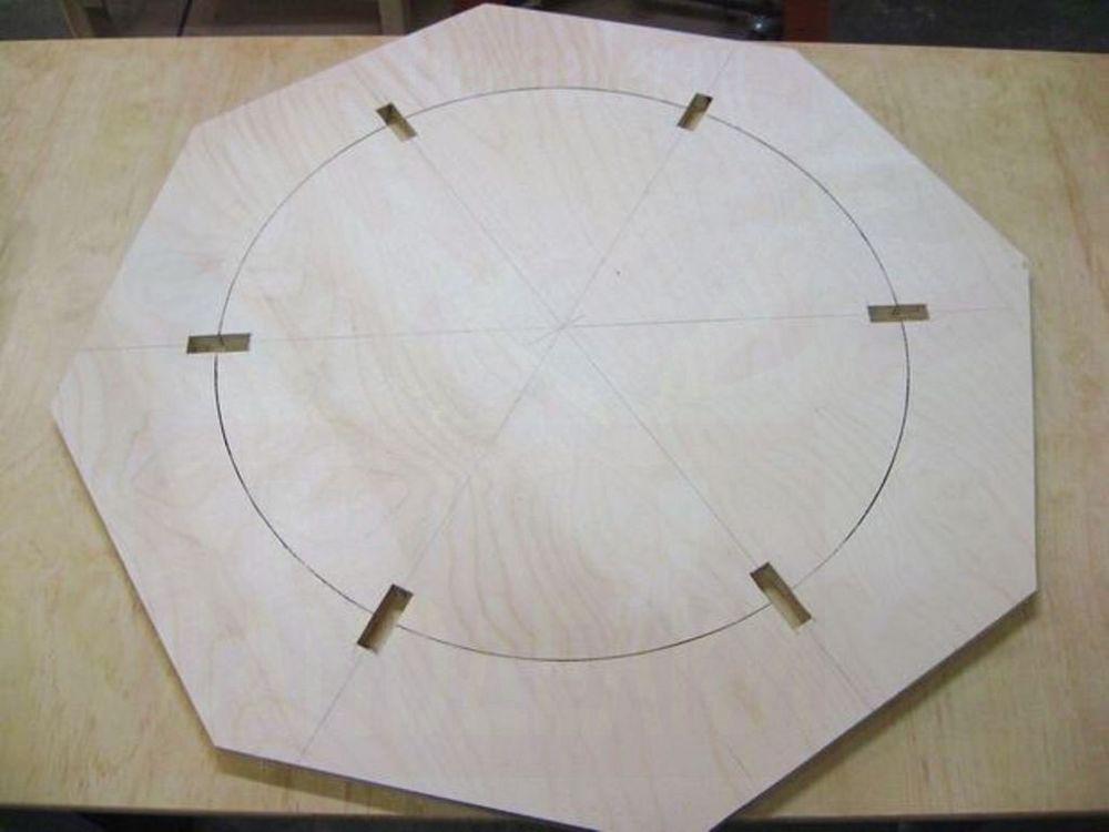 Для начала вырежьте точную копию знака из фанеры. Проведите через центр линии, соединяющие противоположные углы. На пересечении круга и линий от углов необходимо сделать пазы, в которые будут вставлены ножки. Ножек будет шесть.