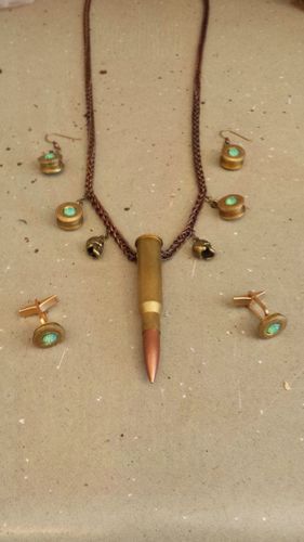 Чтобы ваше ожерелье было более привлекательным, добавим ещё пару колец из меди или латуни. Нам понадобится 10 концов от пули. (Будьте осторожны, чтобы пуля не накалилась - это небезопасно для начинающих.) Нам нужно 4 штуки для колье, 4 для подходящей пары серёжек и 2 пары для запонок. Перед тем как отрезать концы пули, просверлите в них отверстия. Используйте резак для резки медной трубки, держите его как можно ближе к концу. Восемь или десять концов пули нам понадобятся для нашей заготовки, а 2 штуки пойдут на запонки. Чтобы склеить концы используйте тюбик с эпоксидной смолой. Вы можете припаять 2 конца вместе, но при нагреве форма меди может измениться. После того как эпоксидная смола полностью высохнет, просверлите отверстия около шва, где соединяются 2 части. Для сверления используйте 0,16 см биту. Отверстия могут не совпадать по размеру, поэтому придётся их подбирать между собой.
