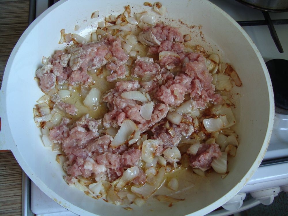 Когда лук обжарится необходимо добавить фарш. Его соотношение говядины и свинины примерно 1 к 2, или можно использовать 100% говяжий продукт. Обжаривать необходимо 7-8 минут.